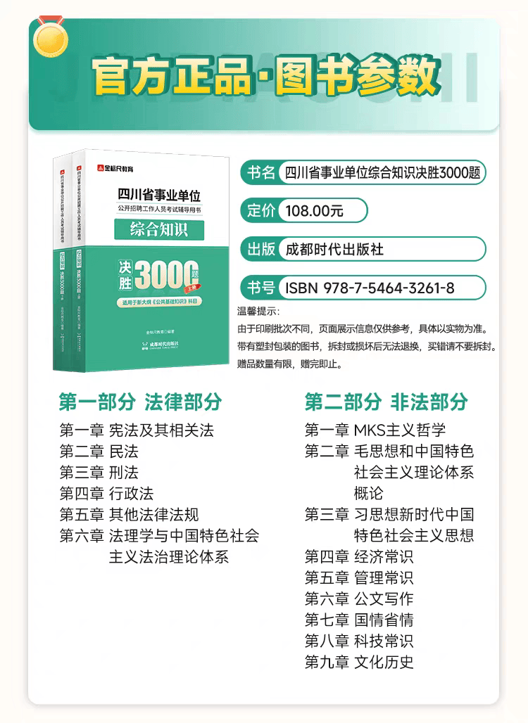 1、【含11.24公基&综测】下单收货添加客服(微信:17725093951)领取课程和电子资料 2、关于公共基础知识和综合能力测试,以11.24省属卷为例,这两科也是按照《综合知识》大纲内容出题拆分成两个科) 3、公共基础知识知识内容为法律 非法 职测 4、综合能力测试内容为 《写作》, 这两个科目都是《综合知识》大纲内容 5、注意事项!!! 因为书籍是塑封包装,拆封后不支持退换货