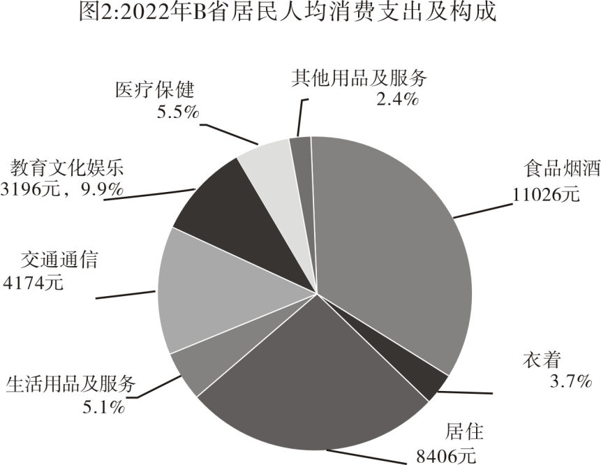 2022年,B省居民人均消费支出32169元,比上年增长1.8%。分城乡看,城镇居民人均消费支出36936元,增长0.9%;农村居民人均消费支出20800元,增长3.9%。