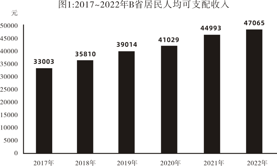 2022年,B省居民人均可支配收入47065元。分城乡看,城镇居民人均可支配收入56905元,比上年增长3.7%;农村居民人均可支配收入23598元,增长5.8%。