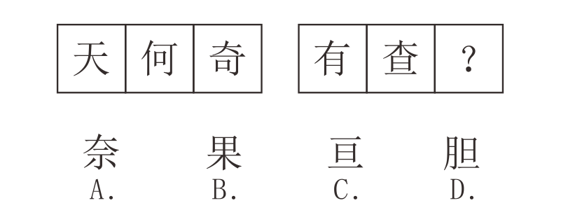 题干图形均为汉字,优先考虑汉字的常见考点汉字结构、笔画数、部分数、封闭区域数。观察发现,第一组图形中,第三幅图形的封闭区域数为前两幅图形的封闭区域数之和;将此规律用于第二组图形,第二组图形前两幅图形的封闭区域数分别为2、2,所以?处应选择一个封闭区域数为4的图形,选项图形的封闭区域数分别为0、4、2、4,故排除A、C两项。再次观察发现,第一组图形中,第三幅图形由前两幅图形的部分构成,第二组图形应用此规律,只有D项符合。