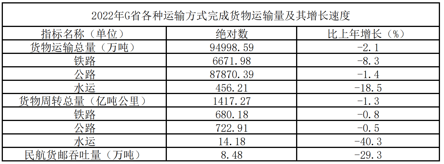 根据题干,要求比重较上年同期有所下降的运输方式,查找2022年G省各种运输方式的货物周转量的增长率小于货物周转总量的增长率的即可。