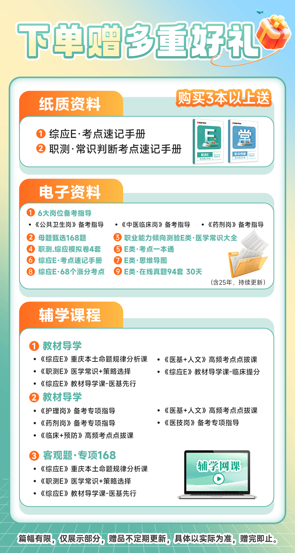 【左下角咨询客服免费领资料+免费答疑 】 书籍针对《医疗卫生E类》 ①下单送最新在线刷历年真题 ②赠送视频课程领取流程,(购买后)在个人-我的优惠劵-点立即使用-然后回到-个人-我的课程中查看。 因为书籍是塑封包装拆封后不支持退换货