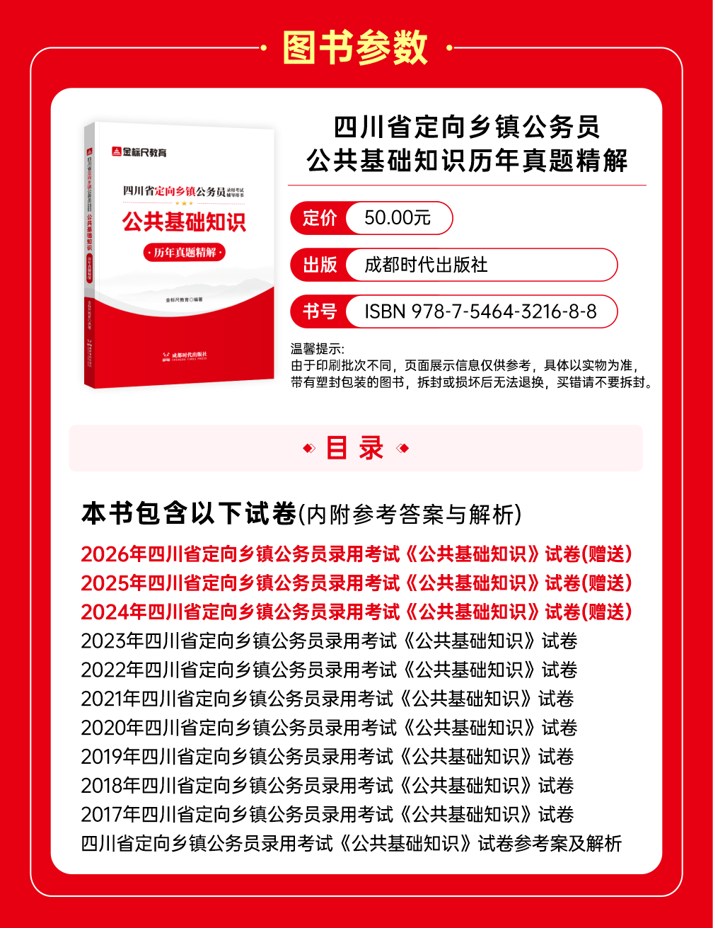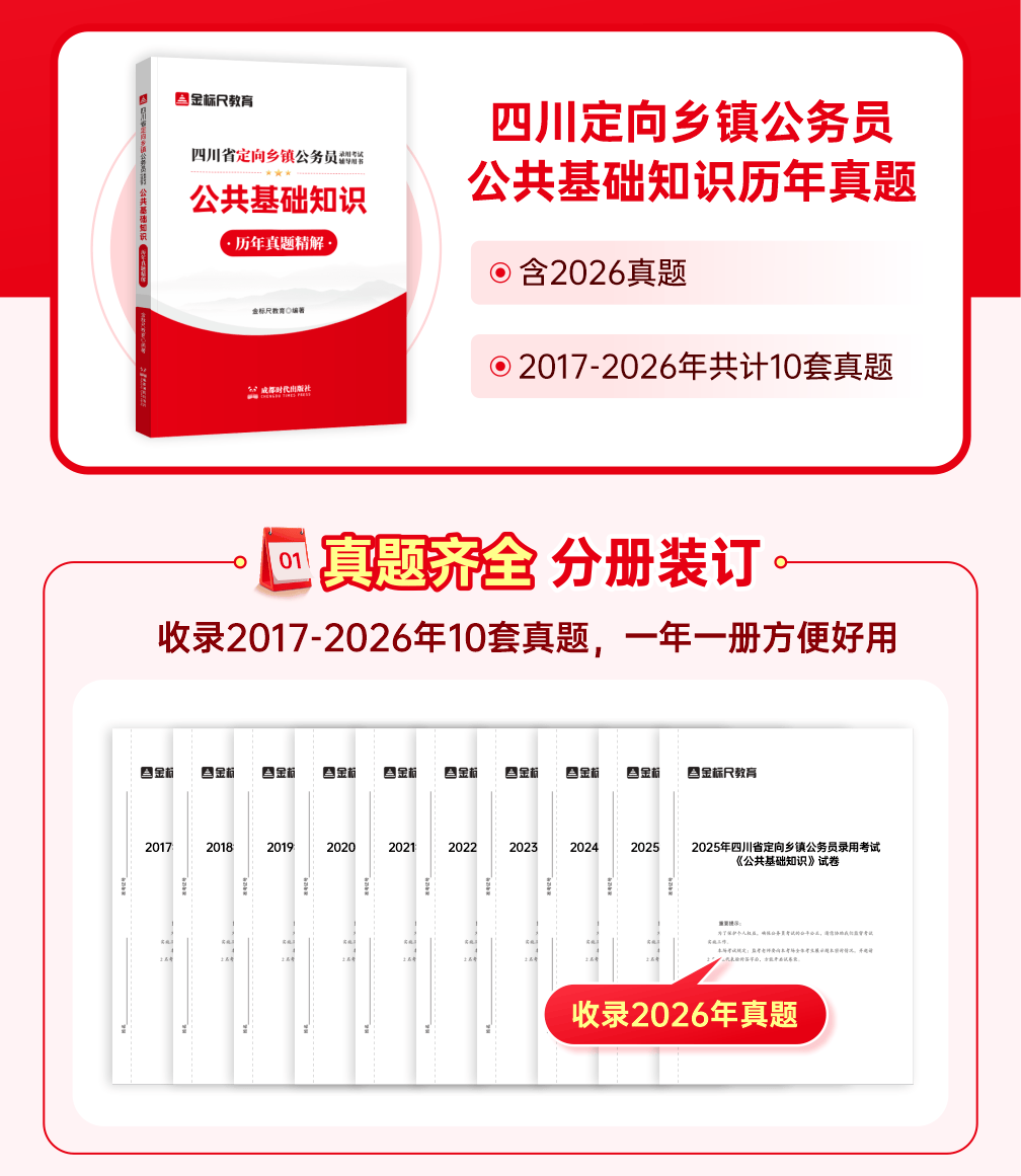 含2026年试卷,2017-2026 共10套试卷;下单收货后添加(微信:18121879436)领取视频课程和备考资料;四川定向乡镇公务员《公共基础知识》真题