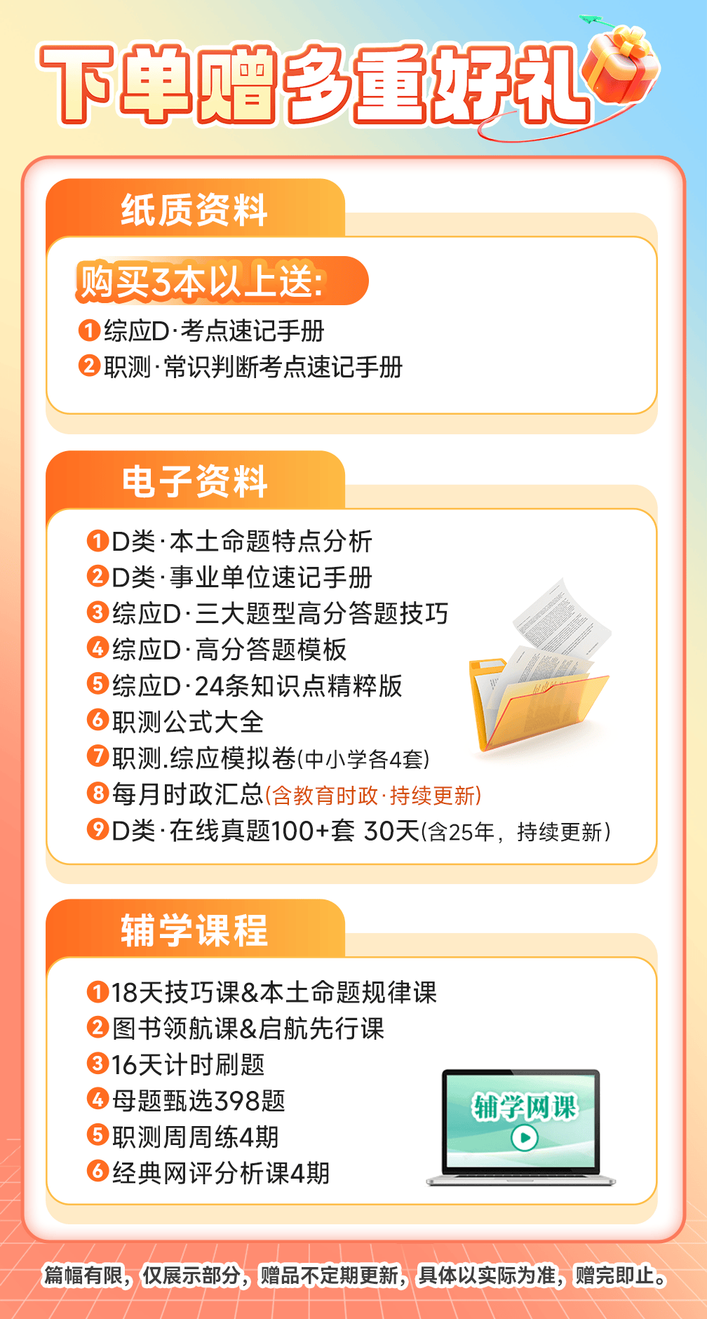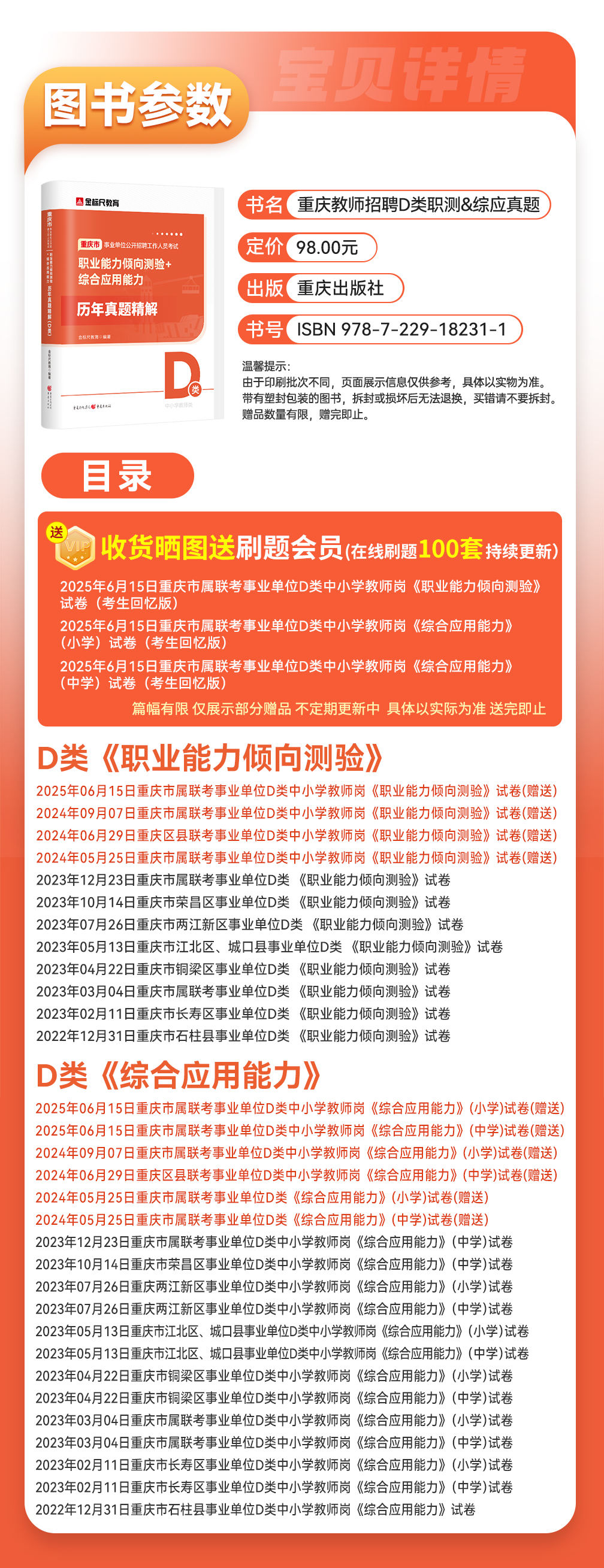 【左下角咨询客服免费领资料+免费答疑 】 书籍针对《中小学教师D类》 ①下单送最新在线刷历年真题 ②赠送视频课程领取流程,(购买后)在个人-我的优惠劵-点立即使用-然后回到-个人-我的课程中查看。 因为书籍是塑封包装拆封后不支持退换货