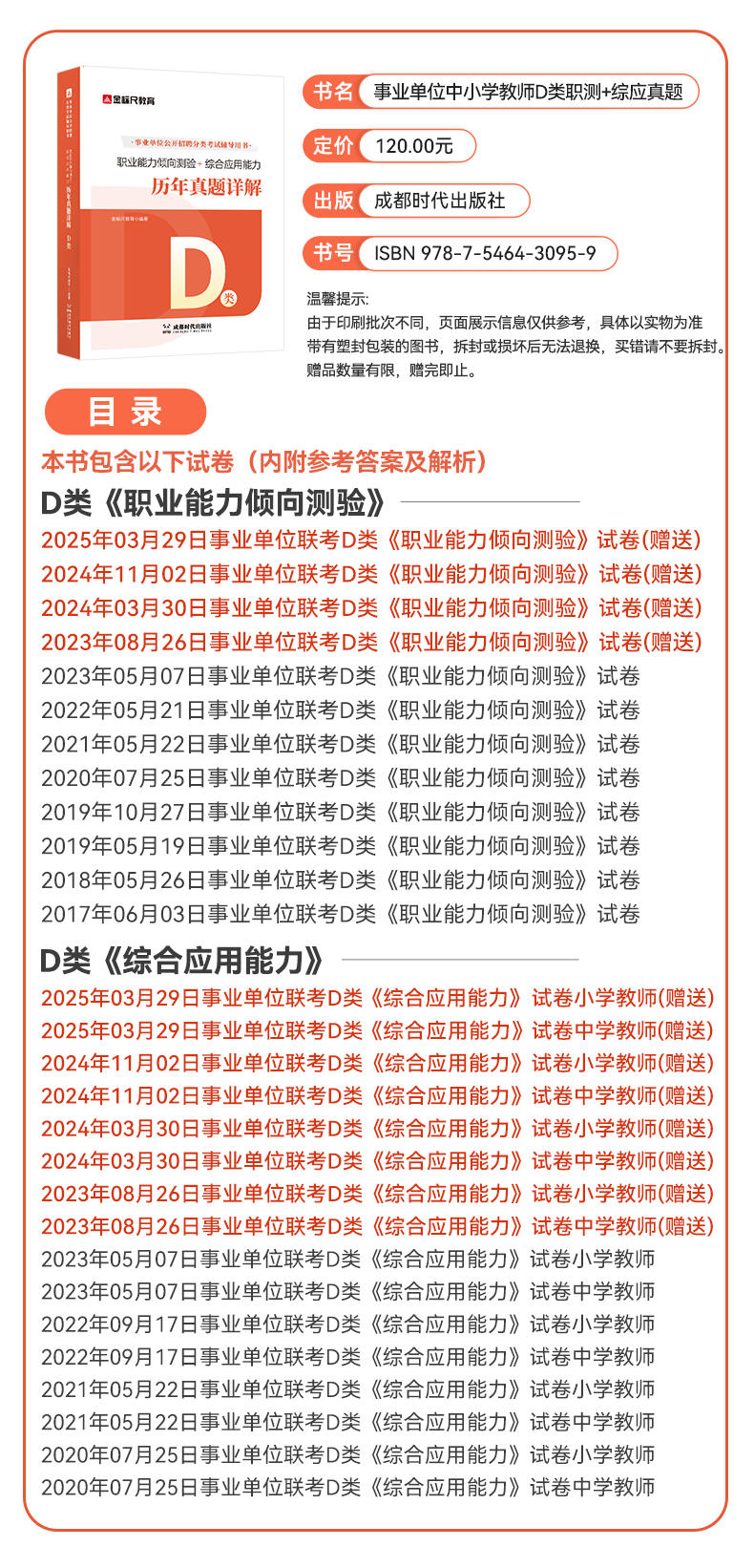 【左下角咨询客服免费领资料+免费答疑 】 书籍针对《中小学教师D类》 ①下单送最新在线刷历年真题 ②赠送视频课程领取流程,(购买后)在个人-我的优惠劵-点立即使用-然后回到-个人-我的课程中查看。 因为书籍是塑封包装拆封后不支持退换货