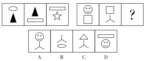 元素组成相似,优先考虑样式规律。发现相邻图形有共同的元素,考虑样式类的渐变。在第一组图中,后一个图形留下了前面图形的一个部分,且后一个图形上面的元素与前一个图形下面的元素相同,将该规律用于第二组图,仅B项符合。故本题答案为B项。