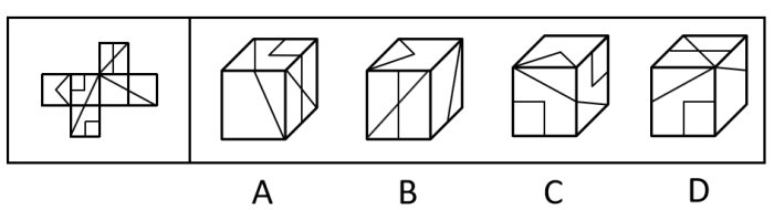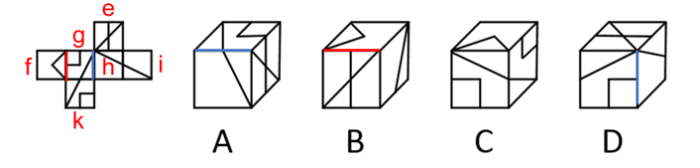 A项,右边的面是面e,面e与面k是相对面不能同时出现,所以上边的面是面g,面g与面i是相对面不能同时出现,所以前边的面是面h。A项由面e、面g、面h组成,面g与面h有公共边,如上图所示,展开图中公共边挨着面g三角形的长直角边,A选项挨着面g三角形的短直角边,选项和题干不一致,排除;B项,由面e、面f、面i组成,选项和题干一致,当选;C项,由面f、面g、面k组成,面f中三角形的底边挨着面g中的小方块,选项中面f中三角形的底边挨着面g中的三角形的长直角边,题干和选项不一致,排除;D项,上边的面是面e,面e与面k是相对面不能同时出现,所以前边的面是面g,面g与面i是相对面不能同时出现,所以右边的面是面h。D项由面e、面g、面h组成,面g与面h有公共边,如上图所示,展开图中公共边挨着面g三角形的长直角边,D选项挨着面g三角形的一个顶点,选项和题干不一致,排除。故本题答案为B项。