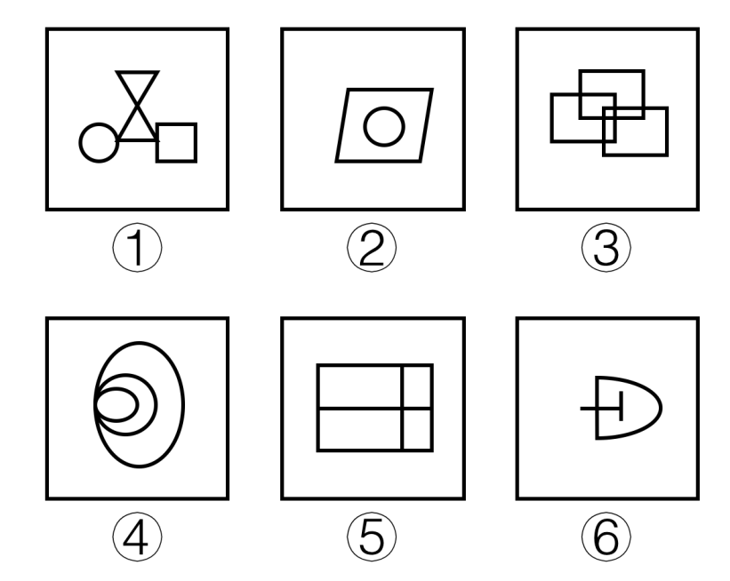 题干存在特征图形,图⑤为“田”字变形,优先考虑笔画数。观察发现,图②⑤⑥为两笔画图形,图①③④为一笔画图形,据此分为两组。