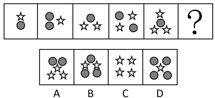 题干图形均由☆与●两种元素构成,可考虑元素代换。运用2倍中间=前+后的公式,代入图1、图2、图3可以得到,2☆+4●=☆+●+●+2☆,简化得到2●=☆,将题干中的☆都代换成●,可以得到●的数量分别为3、4、5、6、7,所以?处应选择换算后有8个●的选项,只有A项符合。故本题答案为A项。
